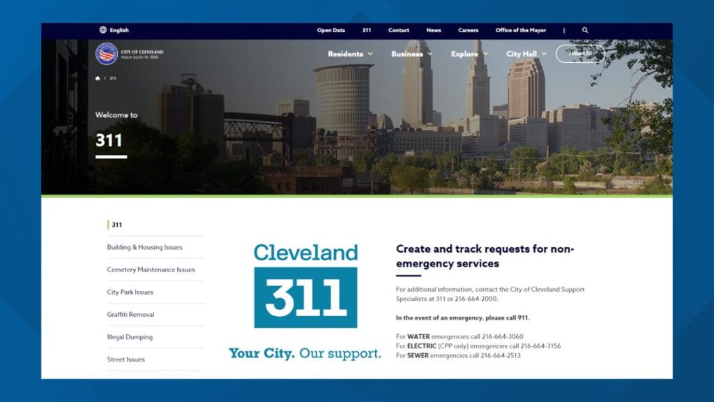 311 is Cleveland’s centralized non-emergency services system. It empowers residents, businesses, and visitors to quickly report and resolve common issues in their neighborhoods—from potholes to illegal dumping, missed trash pickup, streetlight outages, abandoned vehicles, and more. It’s the digital front door to City Hall for everyday concerns that don’t require a 911 emergency response.